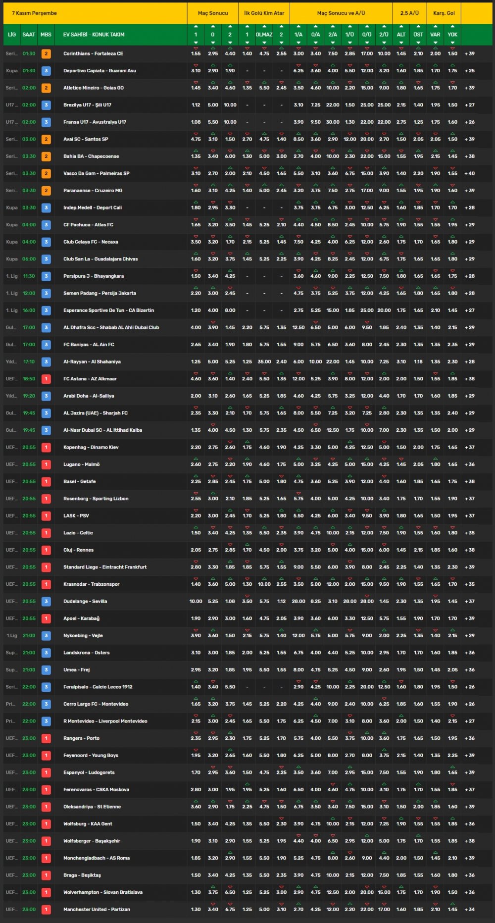 Temsilcilerimiz Beşiktaş, Trabzonspor ve İstanbul Başakşehir Futbol Kulübü'nün kritik karşılaşmalara çıkacağı UEFA Avrupa Ligi'nde dördüncü hafta maçları oynanacak. Birçok şehirde Avrupa'nın önemli ekiplerinin kozlarını paylaşacağı UEFA Avrupa Ligi'nde iddaa severler de hazır kupon ve banko kupon araşturması yaparak kazanç sağlamak amacında. Siz değerli okuyucularımız için belirlediğimiz haberde 7 Kasım Perşembe İddaa tahminleri ve programı yer almaktadır. Bol şanslar dileriz.