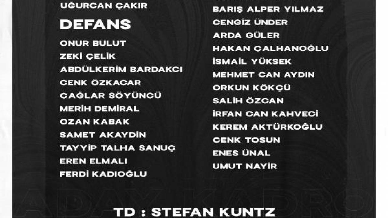 ORTA SAHA / FORVET: Abdülkadir Ömür, Barış Alper Yılmaz, Cengiz Ünder, Arda Güler, Hakan Çalhanoğlu, İsmail Yüksek, Mehmet Can Aydın, Orkun Kökçü, Salih Özcan, İrfan Can Kahveci, Kerem Aktürkoğlu, Cenk Tosun, Enes Ünal, Umut Nayir