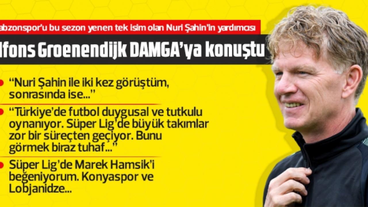 Antalyaspor ile ilk temas kurulduğunda heyecanlandığını ve kendisine anlatılan projelerden memnun kaldığını ifade eden Alfons Groenendijk; “Kulüple görüşmek benim için keyifli ve onur vericiydi. Türkiye bana yeni bir meydan okuma gibi geldi. Nuri Şahin ile iki kez görüştüm ve iyi bir etkileşim aldım. Kendisi üst noktalara gelebilecek kapasitede. Ben de deneyimlerimi ona aktarmak istiyorum. Burada güzel insanlar tanıyorum. Türkiye'ye yabancı biri değilim ve çok sayıda dostum var. Hollanda'da da çok sayıda Türk yaşıyor. Antalyaspor'un büyüme hedefleri var ancak bu sezon kolay olmayacak. Tüm maçları takip ediyor ve ekibimle analizler çıkarıyorum” ifadelerini kullandı.