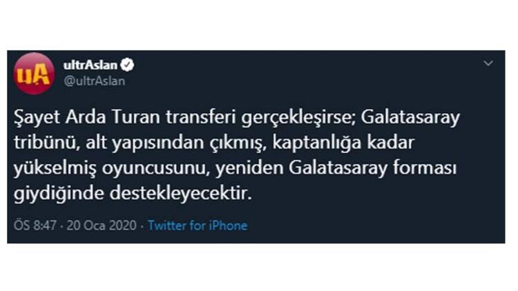 Galatasaray'ın taraftar grubu Ultraslan da Arda'nın takıma geri dönmesi halinde destek vereceklerini duyurdu.