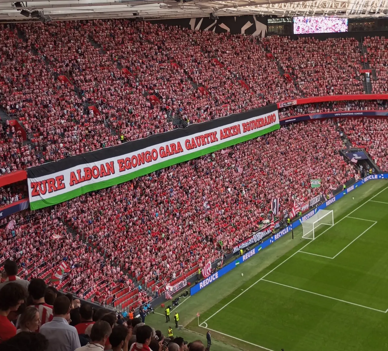 İspanya’nın ünlü kulübü Athletic Bilbao, UEFA Şampiyonlar Ligi’nde Arsenal ile karşılaşırken, tribünlerde dikkat çeken bir mesaj verdi. Estadio de San Mames Stadı’nda oynanan mücadele öncesinde, kırmızı-beyazlı takımın taraftarları, Filistin’e olan desteklerini simgeleyen bir pankart açtı. Pankartta, “Bugünden son güne kadar yanınızda olacağız” yazısı yer alıyordu.