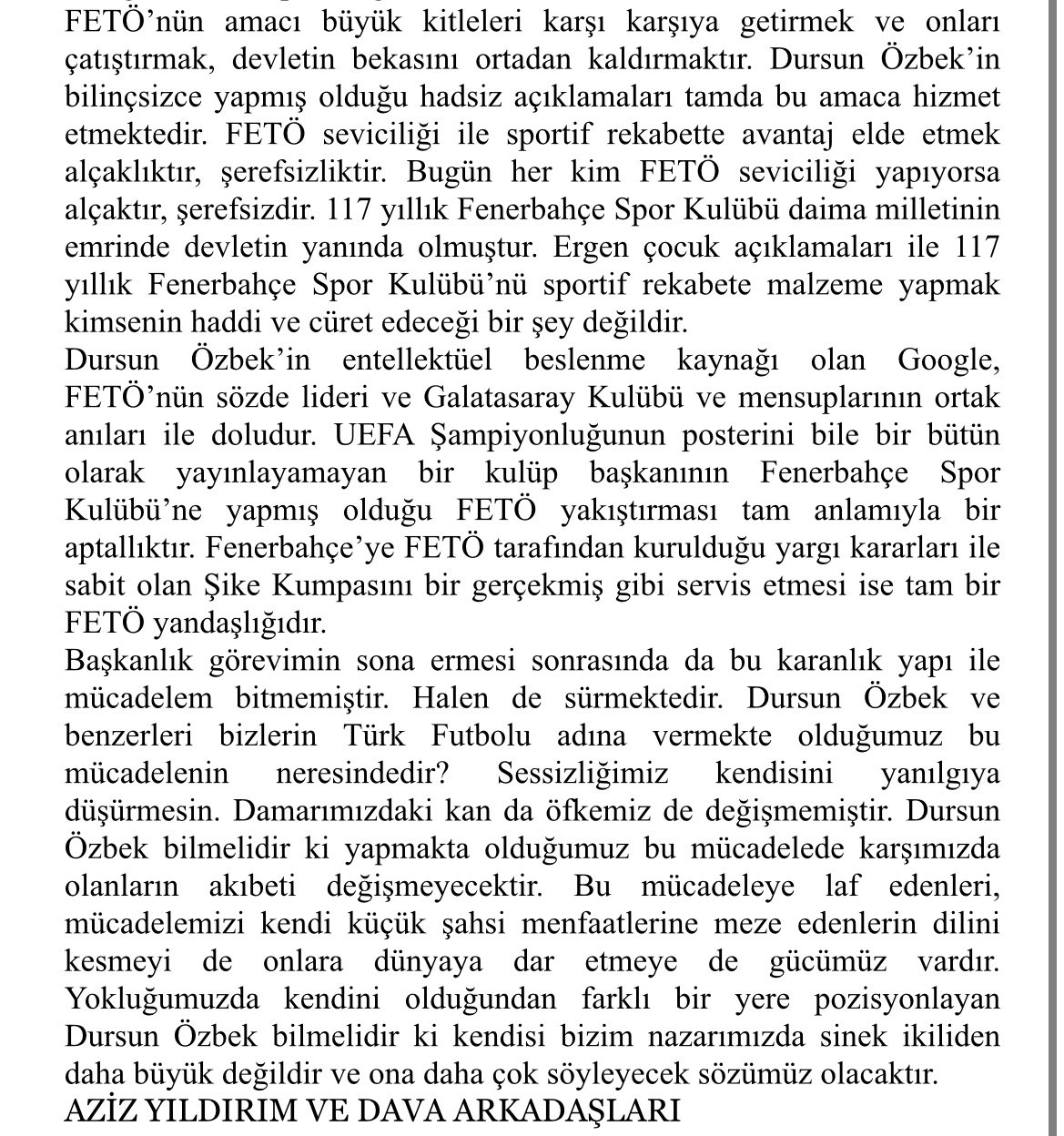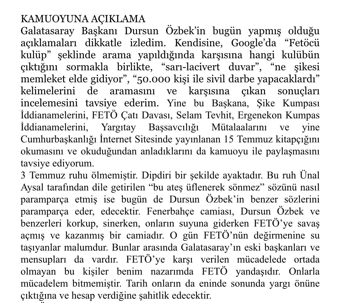 Dursun Özbek’in açıklamalarını dikkatle izlediğini belirten Aziz Yıldırım, “3 Temmuz ruhu ölmemiştir” dedi. Aziz Yıldırım’ın 15 Temmuz süreci ve FETÖ ifadelerini de içeren açıklamasında şu satırlar yer aldı: