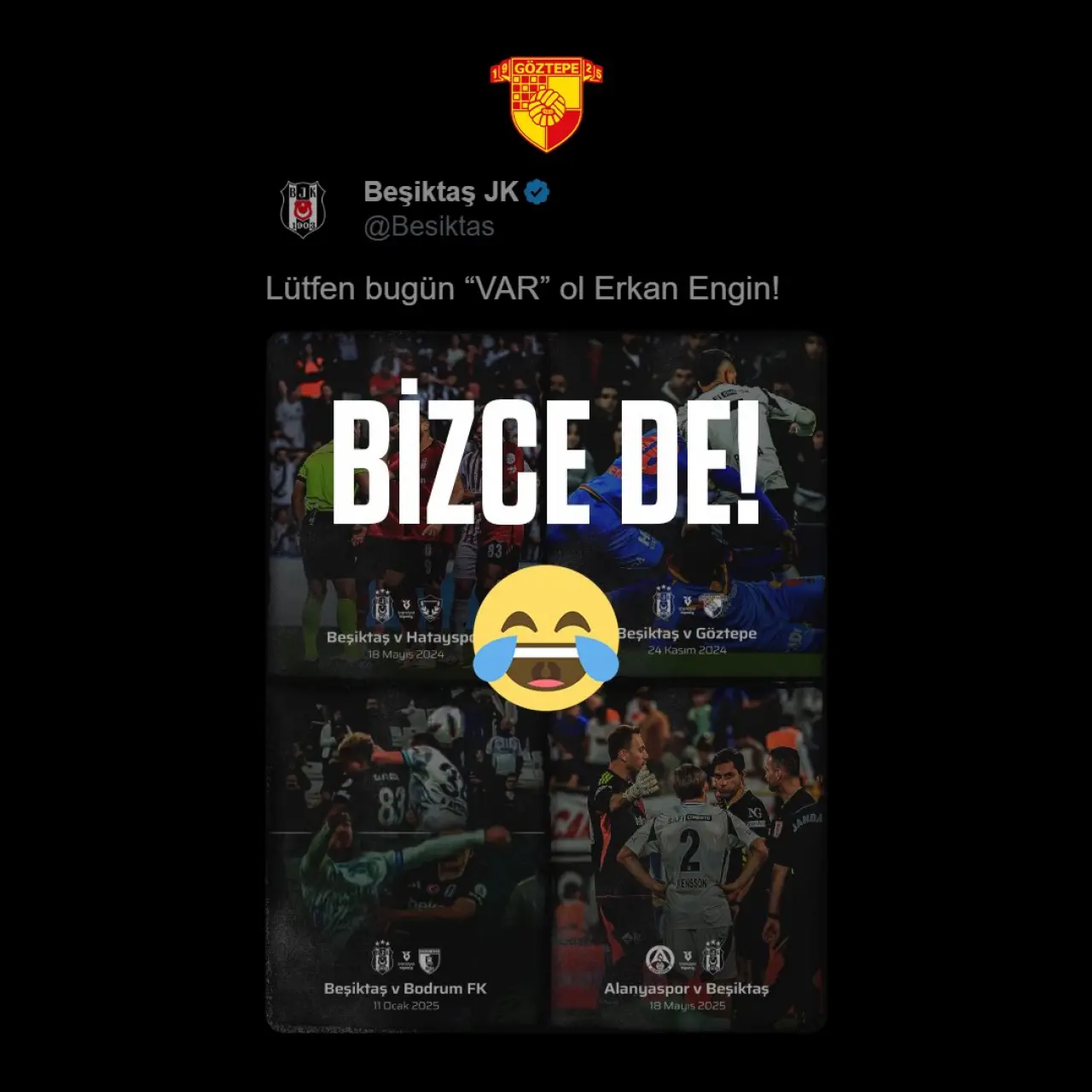 Paylaşımda ayrıca Beşiktaş’ın daha önce oynadığı Hatayspor, Göztepe, Bodrum FK ve Alanyaspor maçlarında yaşanan tartışmalı kararların görselleri de yer aldı.