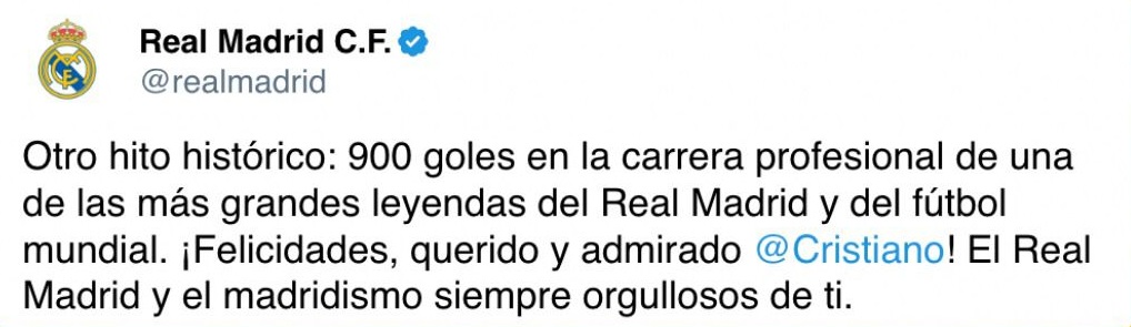 Tebrikler, sevgili ve hayranlık duyulan @Cristiano Real Madrid ve Madridista her zaman seninle gurur duyuyor.”
