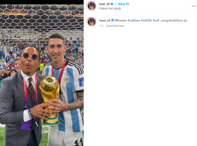 Arjantinli futbolcularla birlikte şampiyonluğu kutlayan Nusret, ünlü tuzlama hareketiyle sevincini paylaştı. Futbolcularla fotoğraf çektiren ve Dünya Kupası’nı tutan Nusret’in görüntüleri, sosyal medyada çok konuşuldu.