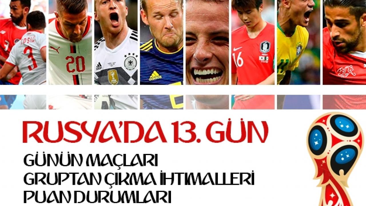 4 takımında gruptan çıkma ihtimali bulunduğu F grubunda ise bugün saat 17:00'de Almanya - Güney Kore, Meksika - İsveç mücadeleleri oynanacak. E grubunda 3. maçlar öncesi Brezilya ve İsviçre 4'er puanda, Sırbistan ise 3 puanda bulunuyor. Gruptan çıkma şansı bulunmayan Kosta Rika ise henüz puanla tanışamadı. Bugün saat 21:00'de Brezilya - Sırbistan, İsviçre - Kosta Rika mücadeleleri oynanacak. İşte gruptan gruptan çıkanları belirleyecek ihtimaller...