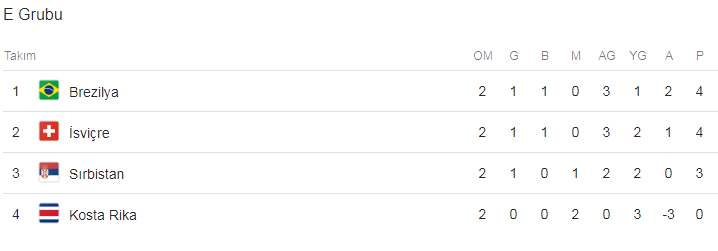 Brezilya, Sırbistan karşısında galip gelir ve gruptan çıkar. İsviçre ise Kosta Rika karşısında beraberlik alır ve gruptan çıkar