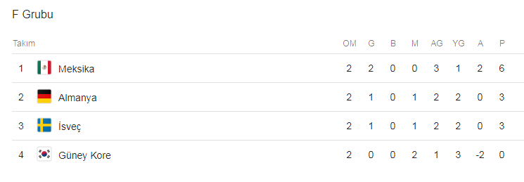 F grubunda ise işler biraz karışık. Son şampiyon Almanya, bugün saat 17:00'de F grubundaki son maçında Güney Kore ile karşı karşıya gelecek. Almanya en az 2 farklı skorla galip gelirse, diğer maçın sonucuna bakmadan gruptan çıkma hakkı kazanacak. Güney Kore'nin tek şansı kazanıp diğer maçta İsveç'in Meksika'ya yenilmesini beklemek.