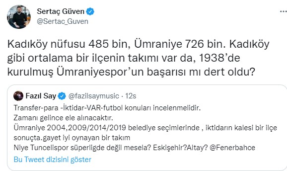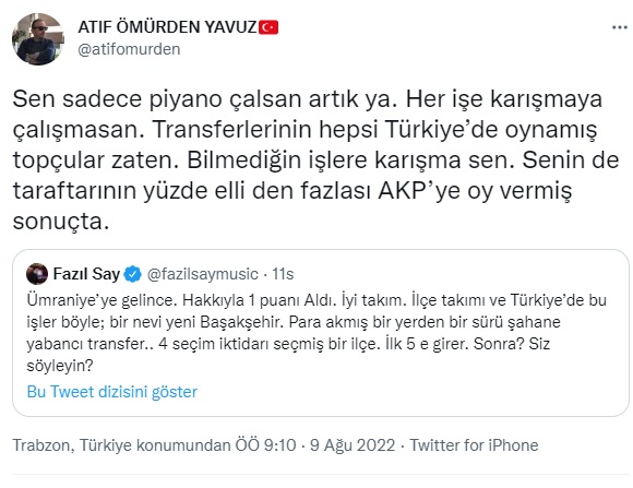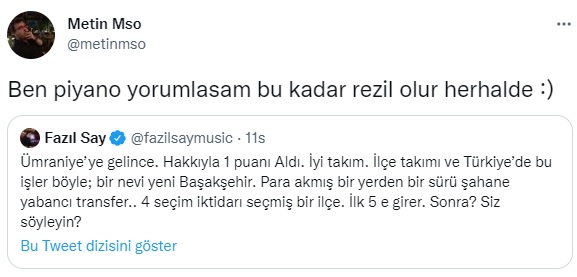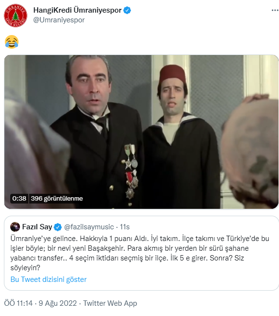 Fazıl Say açıklamalarının devamında Ümraniyespor'un belediye takımı olduğu ve bu nedenle de iktidar ilişkisinin incelenmesi gerektiğine dair bir mesj daha yazdı. Başarılı piyanist her ne kadar İstanbul ekibi için 'Hak ettiler' ifadelerini kullansa da Fenerbahçe'nin rakibi olarak puan kaybedilen bir maçtan sonra kaleme aldığı sözler tepkileri de berbaberinde getirdi. Hangikredi Ümraniyespor da Say'ı tiye alan bir paylaşımda bulunarak Tosun Paşa filmi üzerinden gönderme yaptı.