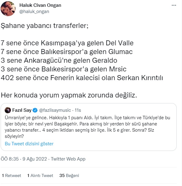 Geçen sezon ivme yakalayan takımın bozulduğuna ve Jorge Jesus'un gelmesi sonrasında Şampiyonlar Ligi'nden elenildiğine dikkat çekip yönetimi eleştiren Fazıl Say; "Hayatın ilk kuralıdır, “iyi giden bir şeyi bozmayacaksın”, mümkün mertebe muhafaza edeceksin. Baktın olmuyor o zaman müdahale edersin. Bunları hatırlarsınız yazmıştım; İsmail Kartal iyi iş çıkarıyor dursun. Kim Min Jae’yi kaybetme. Takımın akışı iyi. Jesus’u getirdi, Şampiyonlar ligi hayal oldu. Ceza kapıda. 8 forvetle maç yapan bir takım. Ligde kötü başlangıç. Kim çeker bu çileyi daha fazla? Kim? Para için bu takımda oynayanlar mı? Fenerbahçe bir ruhtur. Adını doğru telafuz edebilen var mı Fenerbahçe'nin? Hakemler konusuna gelince de... En çok aklımda kalan Ümraniye’nin ilk golü, adam 2 metre ofsaytta ve hamle yapıyor dokunamamışsa da dünyada hangi VAR hakemi bu golü verirdi merak ederim. Biz Fenerbahçe' yiz. Her attığımız ve yediğimizde işimiz VAR'da. Bu çok kötü işte." dedi.