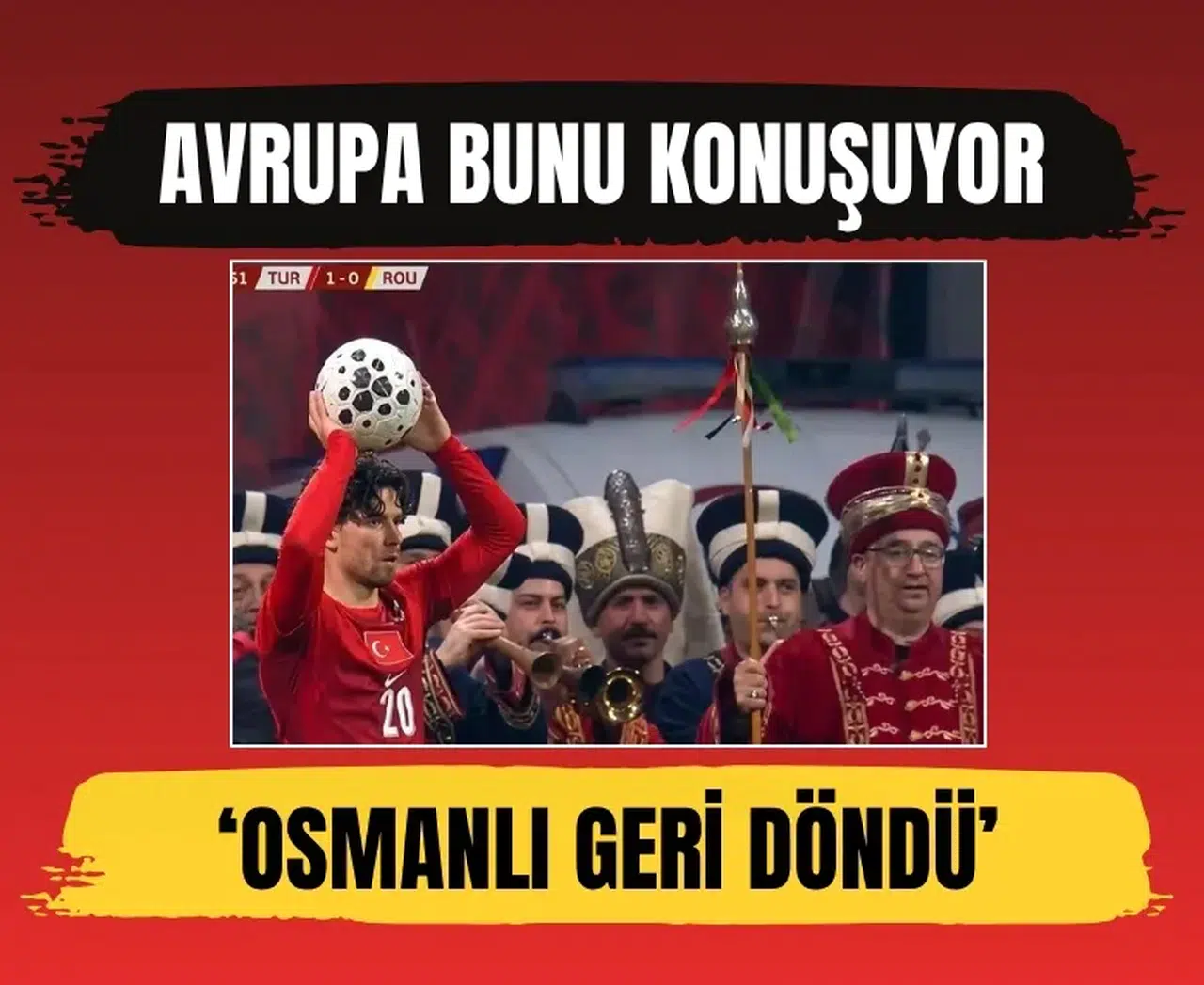 A Milli Futbol Takımı’nın Romanya karşısında aldığı kritik galibiyet, sadece skorla değil, ortaya çıkan bir kareyle de Avrupa gündemine taşındı. 2026 FIFA Dünya Kupası Avrupa Elemeleri play-off yarı finalinde sahaya çıkan milliler, 1-0’lık galibiyetle finale yükselirken, maç öncesi ve sırasında yaşanan bir detay sosyal medyada büyük yankı uyandırdı. Ferdi Kadıoğlu ile mehteran ekibinin aynı karede yer aldığı fotoğraf, Avrupa basınında “Osmanlı İmparatorluğu geri döndü” yorumlarıyla paylaşıldı.