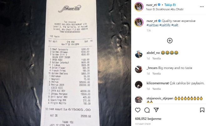 Birçok ülkede şubesi olan Nusr-et isimli zincire giden müşterilerin ödediği fiyat ise 615.065 Birleşik Arap Emirlikleri Dirhemi oldu. Yaklaşık 3.1 milyon TL tutan hesapta ise farklı ürünlerin olması dikkat çekti.