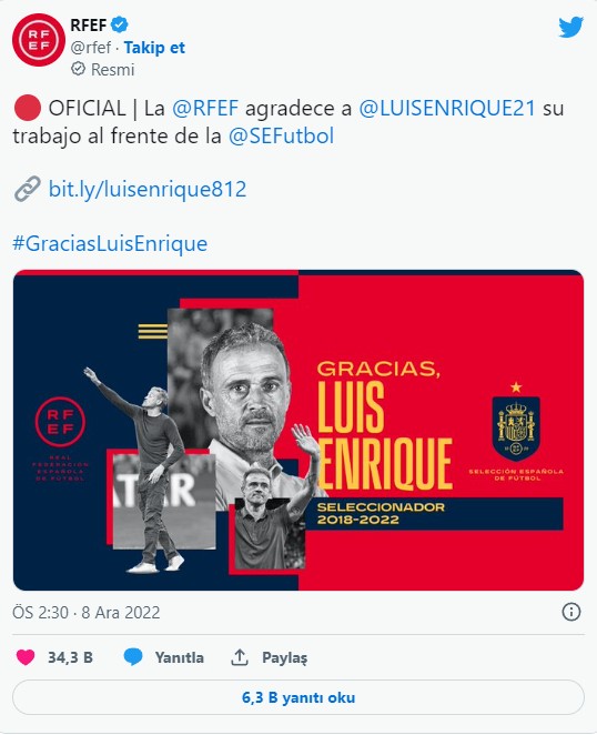 Dünya Kupası son 16 turunda Fas’a penaltılarla elenen İspanya’da teknik direktör Luis Enrique’yle yollar ayrıldı. İspanya Futbol Federasyonu (RFEF), yol ayrımı haberlerini netleştirdi ve 52 yaşındaki çalıştırıcının sözleşmesinin feshedildiğini açıkladı.