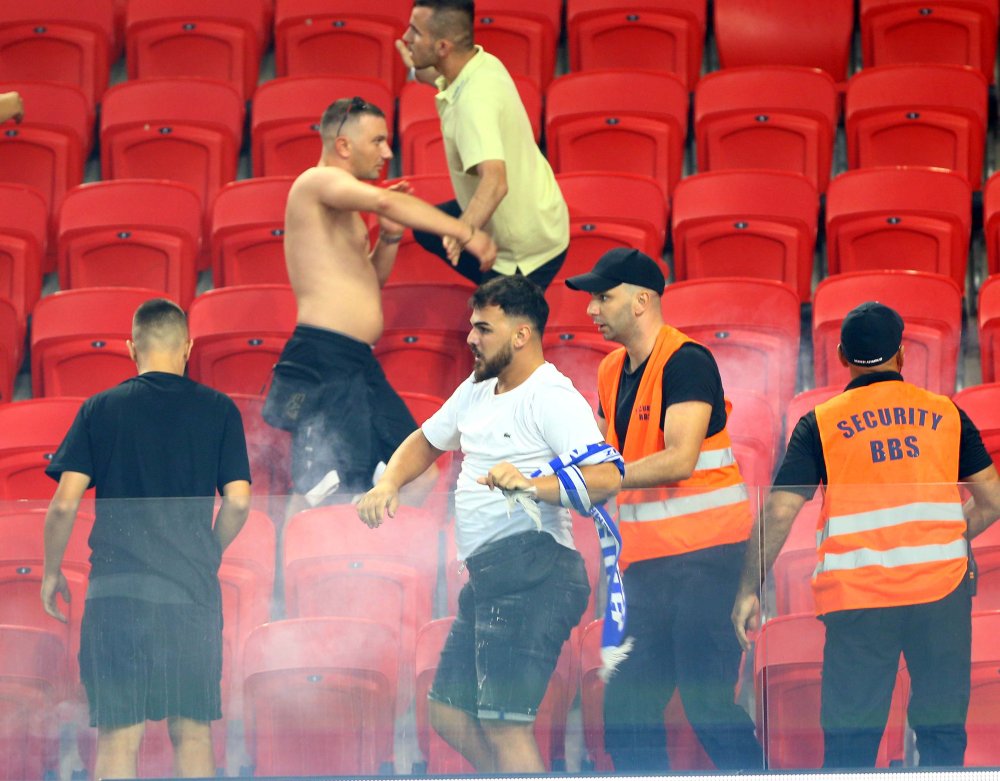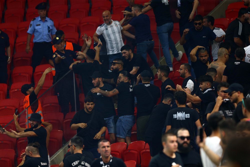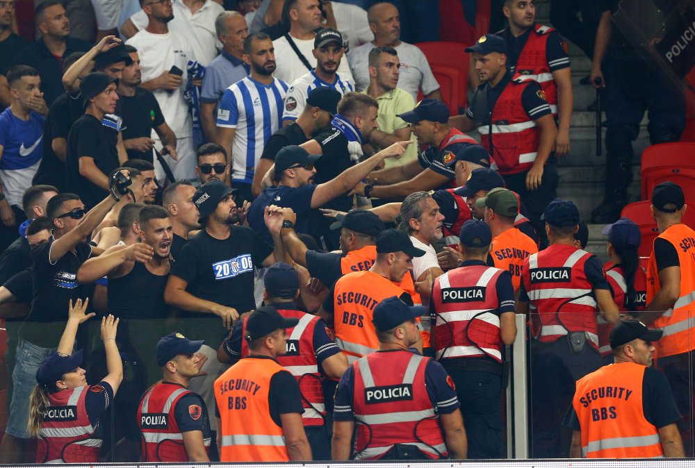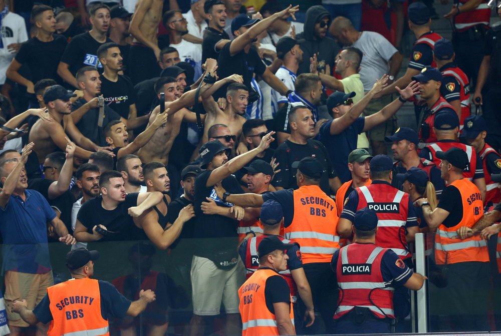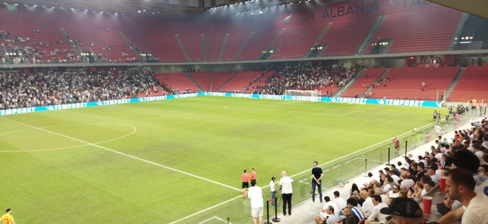 Kombetare Arena'da saat 21.00'de başlaması gereken karşılaşma, Beşiktaş trisbünlerinden sahaya atılan meşaleler dolayısıyla başlayamadı. Taraftarların meşale atmasının ardından karşılaşmanın hakemi Stuart Atwell, takımları soyunma odasına yolladı.