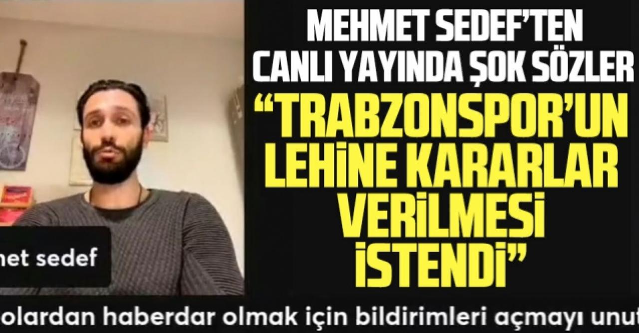 Mehmet Sedef TGRT yorumcusu Bülent Uslu'nun da yer aldığı yayında şunları söyledi; "Duyduğum 2 hakem daha ar. Onlara da şunlar söylenmiş. Net duydum, kulağımla duydum. Trabzon'un lehine kararlar vereceksiniz demişler. Belki siz de duyrmuşsunuzdur. Bilmiyorum. Bana net geldi bilgi. Onlar da kabul edemeyeceklerini söyleyip bırakmak istediklerini söylemiş. Eğer böyle olacaksa ligin tescil edilmemesi gerekir. Bazı kulüp başkanları da şikayet ediyor."