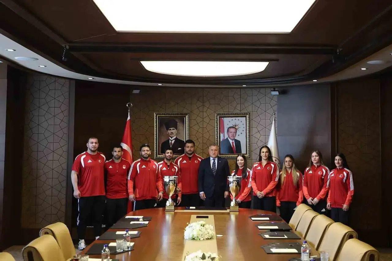 Gençlik ve Spor Bakanı Osman Aşkın Bak, Arnavutluk’ta düzenlenen Avrupa Şampiyonası’nda 2 altın, 3 gümüş ve 6 bronz madalya ile dönen milli sporcularla bir araya geldi. Türkiye Güreş Federasyonu Başkanı Taha Akgül’ün de eşlik ettiği kabulde, minderlerdeki büyük başarılar masaya yatırıldı. Taha Akgül, Bakan Bak’a Türk güreşine sunduğu katkılardan dolayı şükranlarını sunarak, çıtayı daha da yukarı taşımak için kararlılıkla çalışacaklarını vurguladı.
