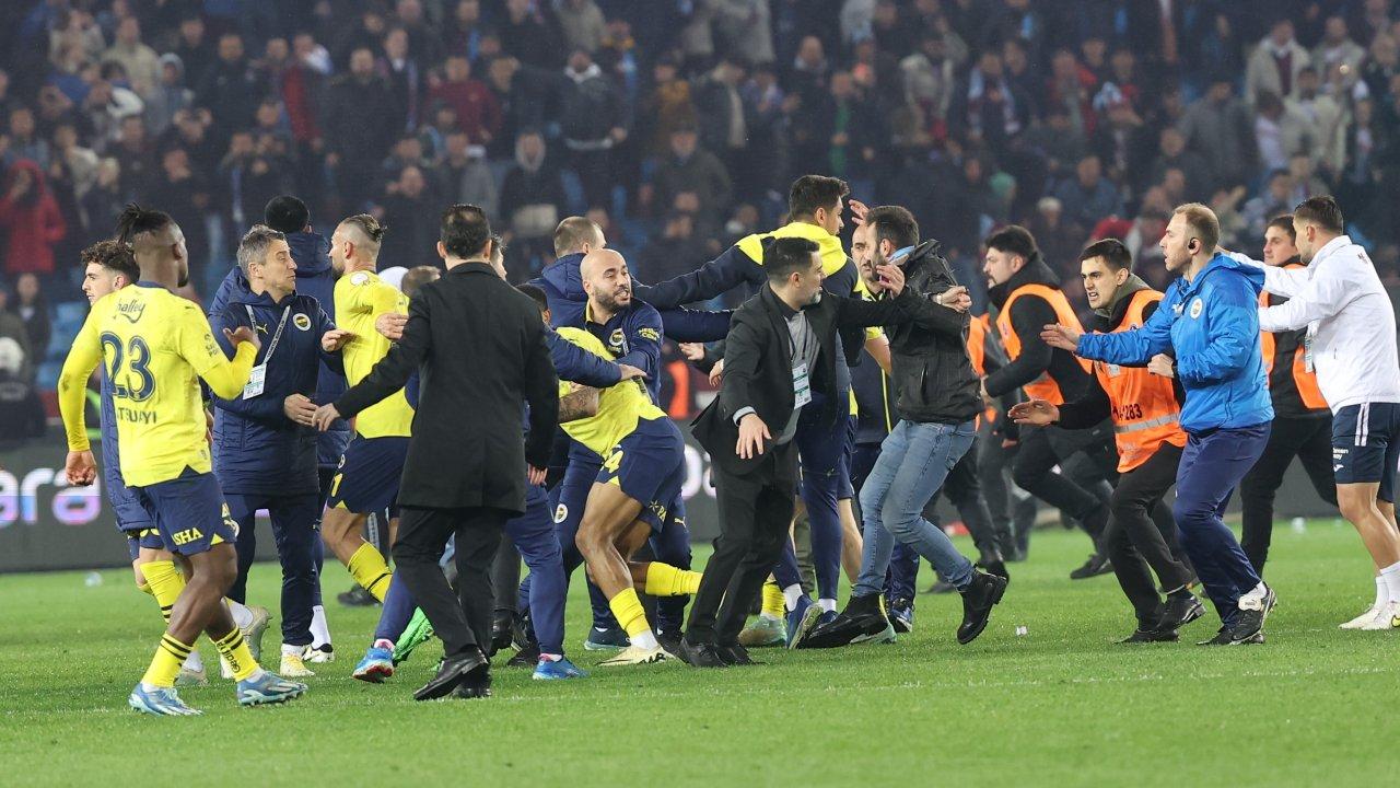 Trabzonspor - Fenerbahçe maçının özellikle ikinci yarısında tribünden atılan yabancı maddeler sonrası oyun 3 dakika durdu. Karşılaşmanın bitiş düdüğü sonrası Papara Park Stadyumu'nda istenmeyen olaylar yaşandı. Sarı-lacivertli futbolcuların orta sahadaki galibiyet sevinci sırasında bazı bordo-mavili taraftarların sahaya girmesiyle tekme ve yumruklar havada uçuştu. Sahaya inen bazı taraftarlar, ellerine aldığı korner direğiyle Fenerbahçeli oyunculara doğru koştu.