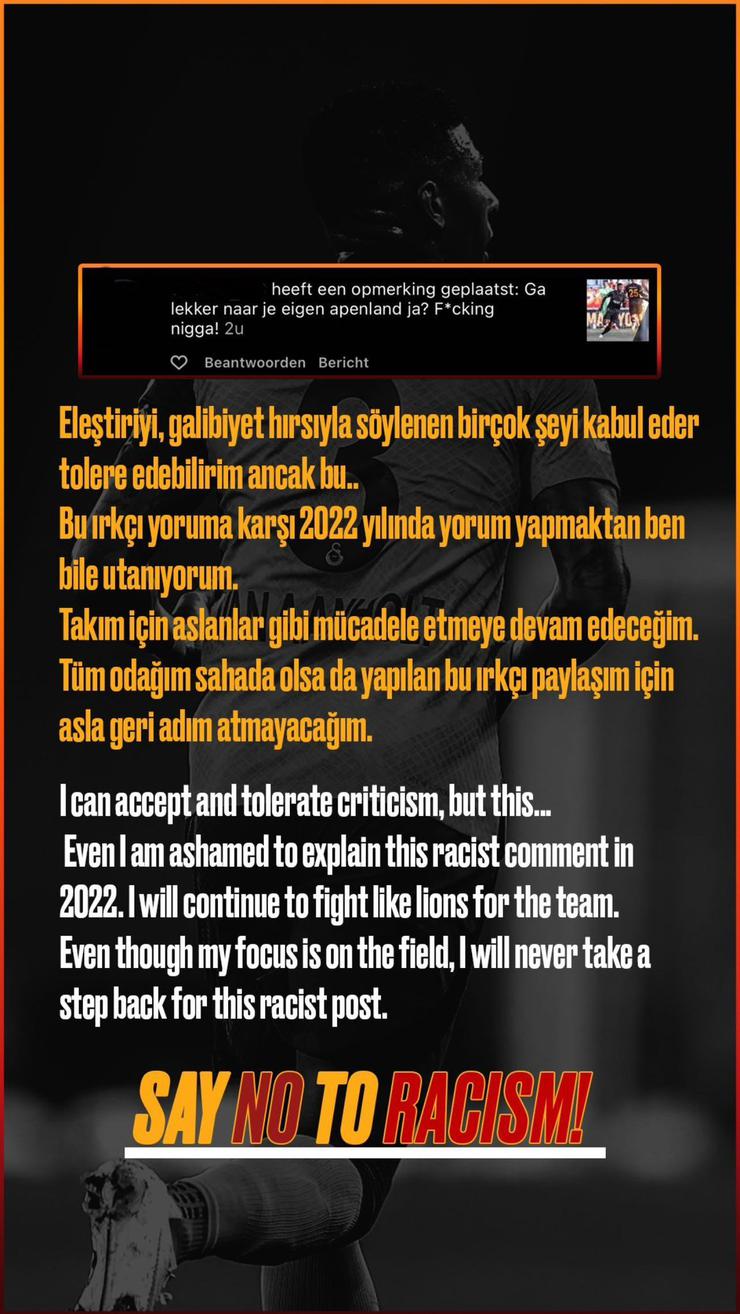 Hollandalı futbolcu yaptığı paylaşımda "Galibiyet hırsıyla söylenen birçok şeyi tolere edebilirim ancak bu ırkçı yoruma karşı 2022 yılında yorum yapmaktan ben bile utanıyorum. Takım için aslanlar gibi mücadele etmeye devam edeceğim. Tüm odağım sahada olsa da bu ırkçı paylaşım için asla geri adım atmayacağım." ifadelerine yer verdi.