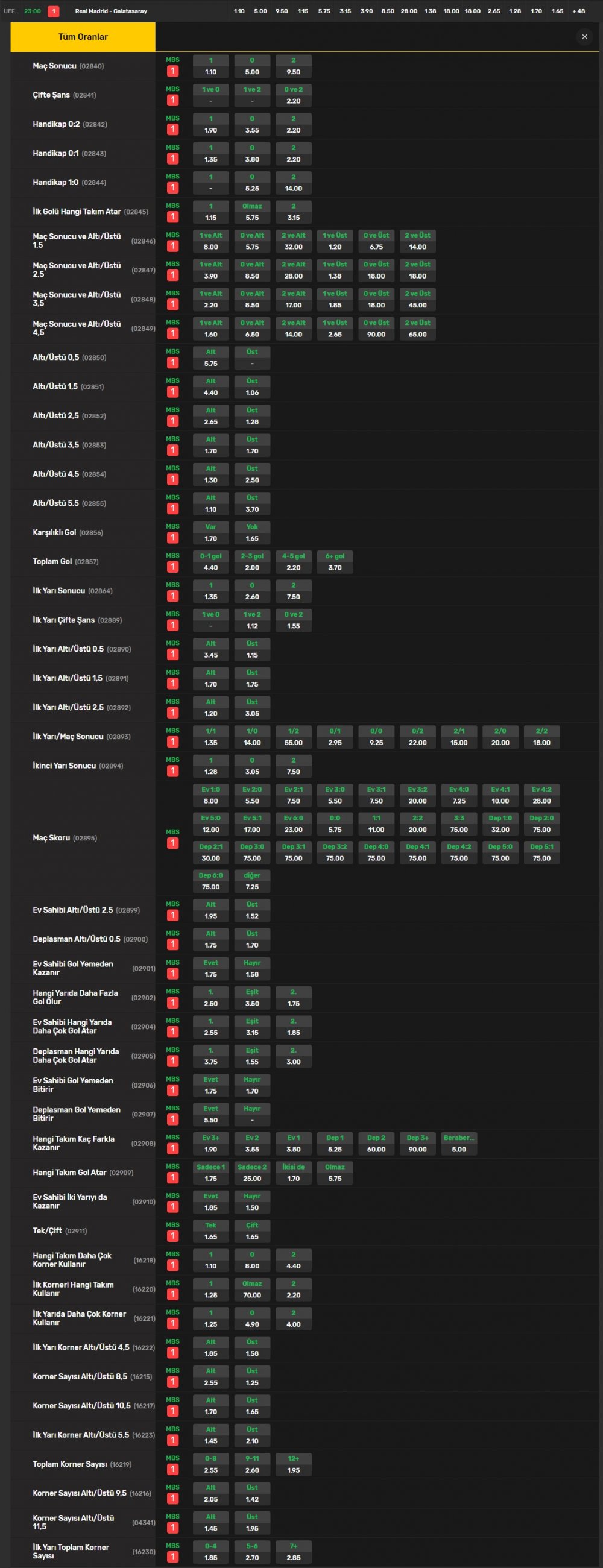 Taraf bahisinde Real Madrid 1.10 ile ezici favori olarak gösteriliyor. Galatasaray galibiyetine ise 9.50'lik oran belirlenmiş. Beraberlik ise 5.50 katı kazandırıyor. Ayrıca pek çok tahminle canlı iddaa da oynayabilirsiniz.