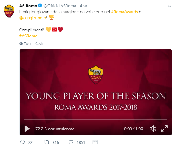 Kulübün internet sitesinde yer alan açıklamada, “Takıma geçen yaz katılan 20 yaşındaki oyuncu, sezonun ikinci yarısında Eusebio Di Francesco’nun takımının ligde ilk 3’e girmesine yardım etti. Bu performansı, Türk oyuncunun taraftar oylarını kazanmasını sağladı. Cengiz, ikinci sıradaki Lorenzo Pellegrini’ye fark atarak taraftar oylarının çoğunu alıp önemli bir galibiyet elde etti.” ifadelerine yer verildi.