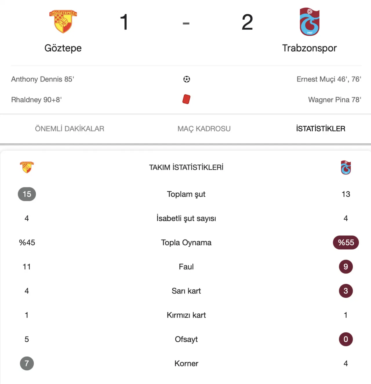 Trabzonspor’da 78. dakikada Wagner Pina, bariz gol şansını engellediği gerekçesiyle kırmızı kartla oyun dışı kaldı. Göztepe’den Rhaldney ise uzatma dakikalarında ikinci sarı karttan atıldı.