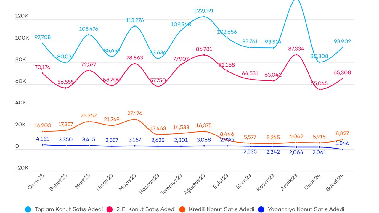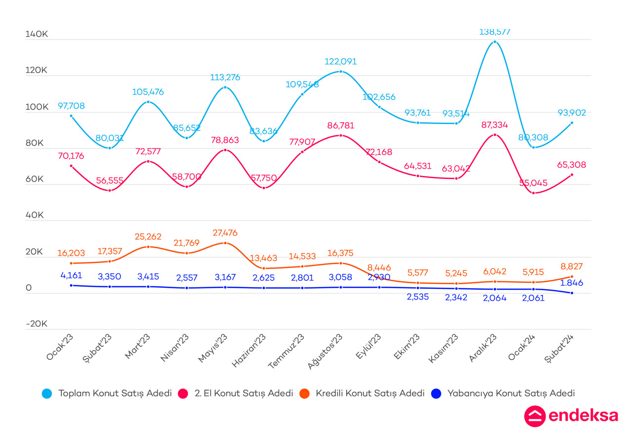 İkinci el konut satış piyasası ise şubat ayında hem aylık hem de yıllık perspektifte arttı. Toplam 65 bin 308 adet ikinci el konutun satıldığı yılın ikinci ayında, ocak ayına nazaran yüzde 19, 2023 Şubat ayına kıyasla ise yüzde 15 artış kaydedildi. İkinci el konut satışlarının toplam içinde payı yüzde 70 oldu.