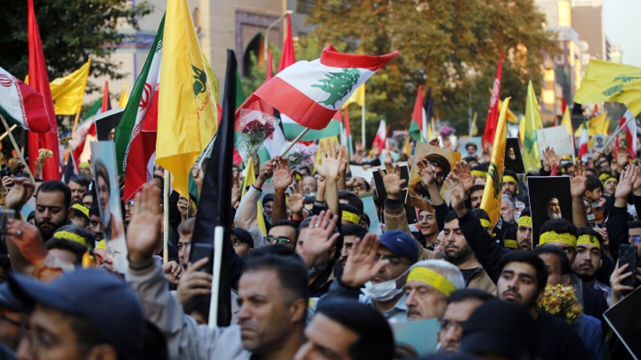 İran, Lübnan ve Filistin bayrakları, Hizbullah flamaları ile Nasrallah'ın posterlerini taşıyan göstericiler, İsrail ve ABD aleyhine sloganlar attı.