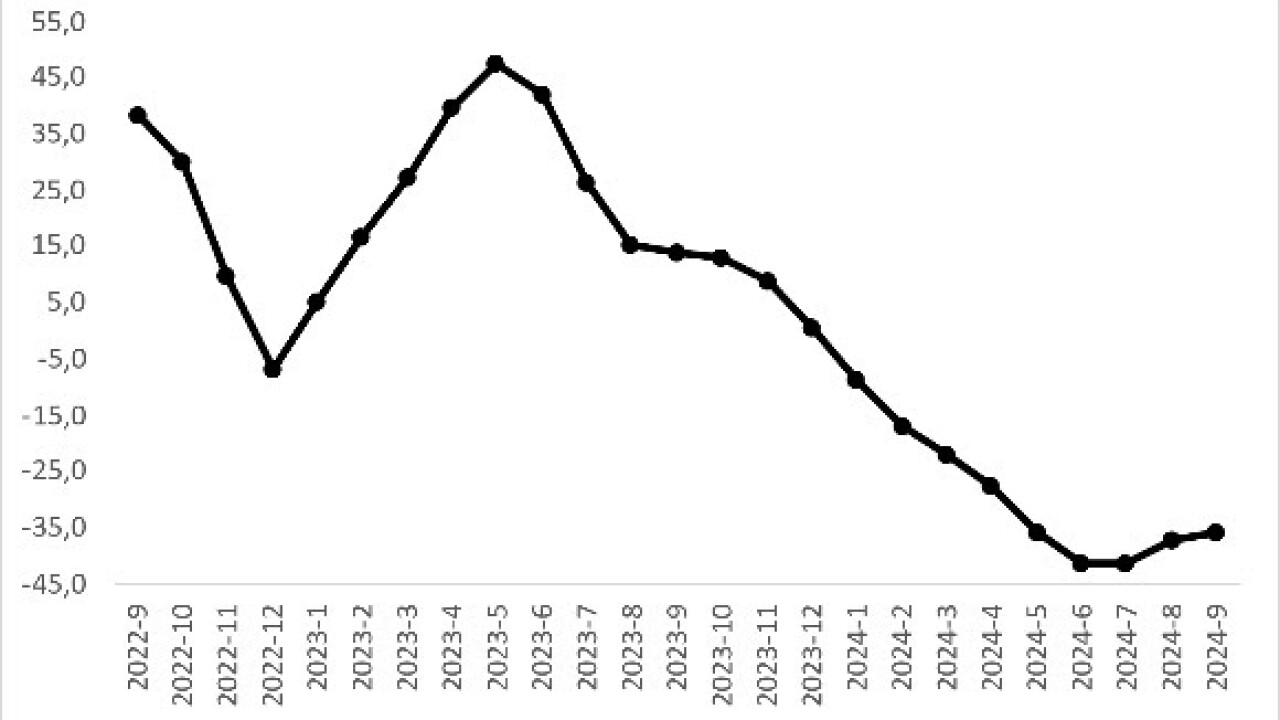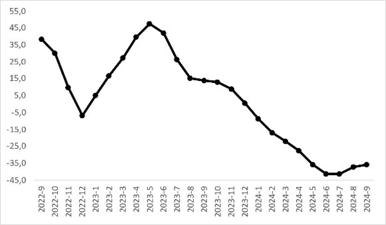 Enflasyondan arındırıldığında otomobil ortalama reel fiyatının 15 aydır düştüğü görülüyor (Şekil 1-üst panel). Reel fiyat endeksi Ağustos ayına kıyasla yüzde 1,2 azalarak 159,4 oldu. Reel fiyatlardaki yıllık değişim de hala negatif seyrediyor (Şekil 1-alt panel). 2023 Mayıs’ta yüzde 47,9’a ulaşan değişim oranı takip eden aylarda sürekli azalarak 2024 Temmuz’da yüzde -41,1’e geriledi. Reel fiyatlardaki yıllık değişim oranı Eylül’de de Ağustos’taki gibi bir miktar yükselerek yüzde -35,6 oldu.