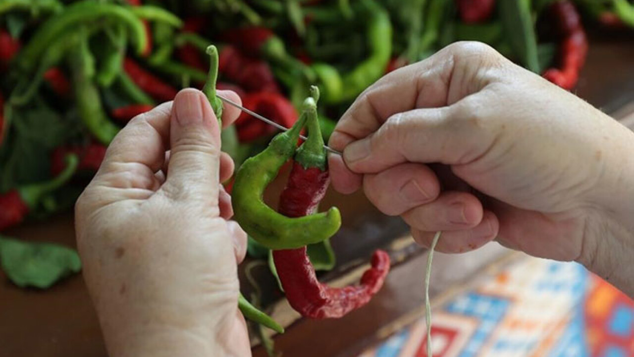 Kentte hasadı devam eden acı biberler ev hanımları tarafından önce ipe diziliyor, sonra gölgelik alanlarda kurumaya bırakılıyor.