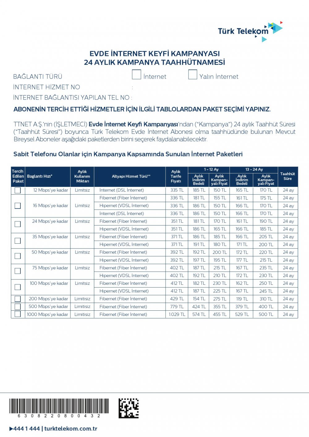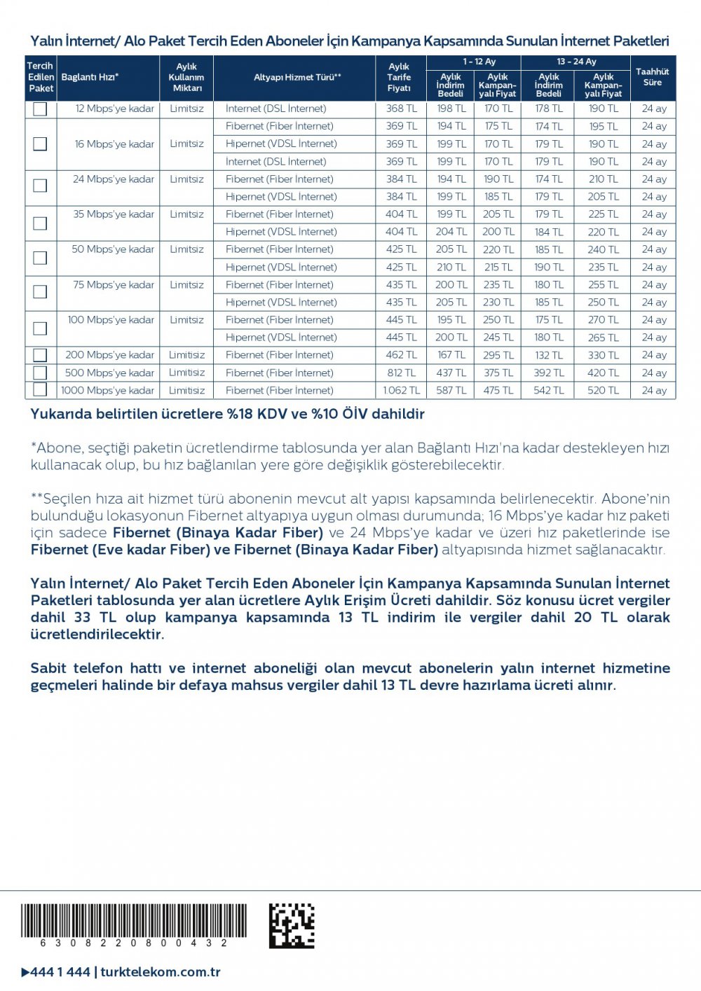 - Kampanya fiyatları 24 ay boyunca indirimli olup indirim süresi sonunda yürürlükteki tarife ücreti geçerlidir. Kampanya internet altyapı olanakları ile sınırlıdır. Türk Telekom kampanya süresini uzatma hakkını saklı tutar. Kampanya detayları için 444 1 444 Türk Telekom Müşteri Hizmetleri'ni arayabilir veya Türk Telekom Satış Noktaları'na başvurabilirsiniz.