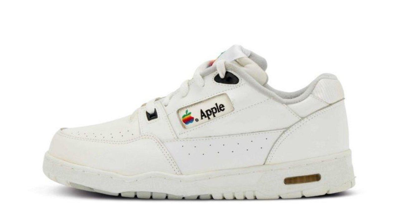 Beyaz ayakkabılar, Apple'ın gökkuşağı renklerine boyanmış eski logosuna sahip.