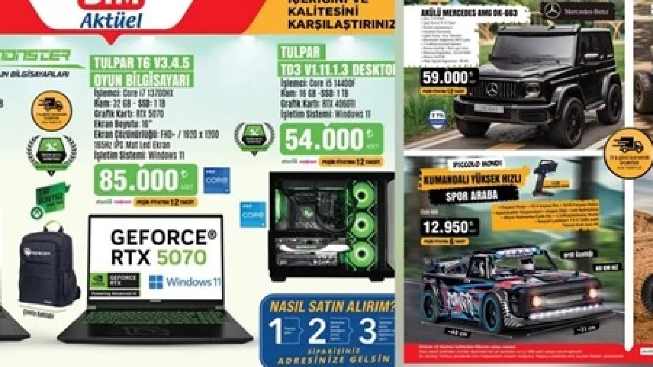 BİM’in aktüel teknoloji kataloğunda en dikkat çekici ürünlerden biri, GeForce RTX 5070 ekran kartı ile donatılmış Tulpar T6 V3.4.5 model oyuncu dizüstü bilgisayarı oldu. Yüksek performanslı bu cihaz; 16 inçlik Full HD+ 165Hz ekran, Intel Core i7-13700HX işlemci, 32GB RAM ve 1TB depolama gibi üst düzey özelliklerle sadece 85.000 TL fiyat etiketiyle teknoloji severlerle buluşuyor.
