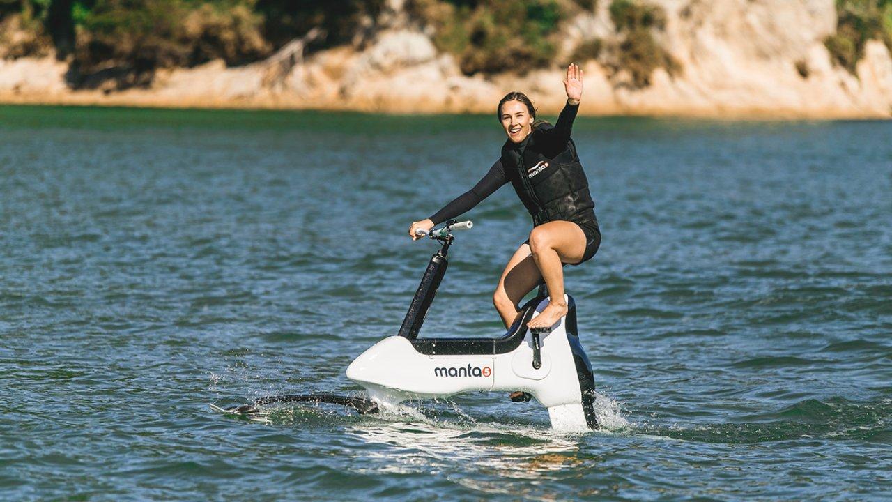 Dünyanın ilk su üstü elektrikli bisikletinin piyasaya çıktı. Bisiklet, suda 12,4 mil hızla su üzerinde ilerliyor.