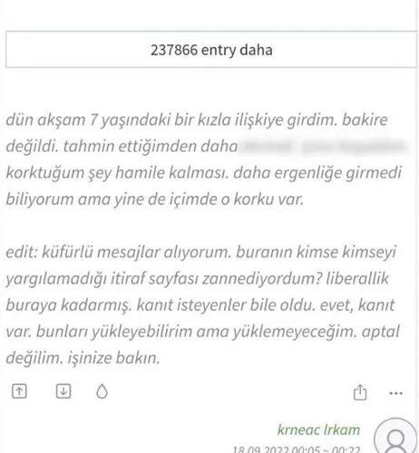 Sosyal medyada yayılan bir itiraf herkesi isyan noktasına getirdi. Ekşi İtiraf'ta 'Dün akşam 7 yaşındaki bir kızla ilişkiye girdim. Bakire değildi. Umarım hamile kalmaz' yazısını yazan 'krneac ırkam' rumuzlu kullanıcıya tepki yağıyor. İşte korkunç olayın ardından verilen tepkiler...