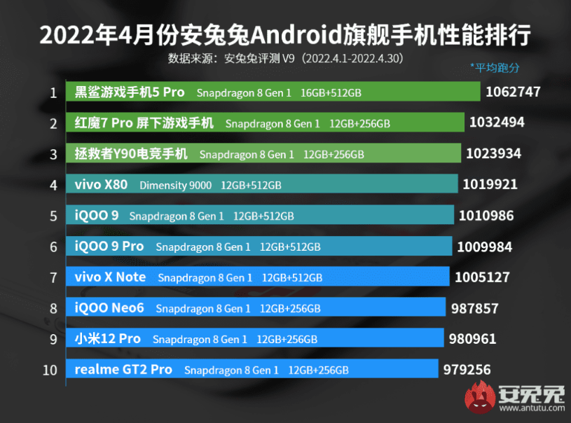 AnTuTu(telefonları ve diğer cihazları karşılaştırmak için yaygın olarak kullanılan bir yazılım kıyaslama aracı)'dan aktarılan bilgilere göre; nisan ayının en hızlı Android telefonlar listesine Qualcomm Snapdragon 8 Gen 1 damga vurdu. Bir süredir rakibi MediaTek Dimensity 9000’e büyük farkla üstünlük kuran yonga seti; bu ay da listedeki 10 modelin 9’unda karşımıza çıkmayı başardı.