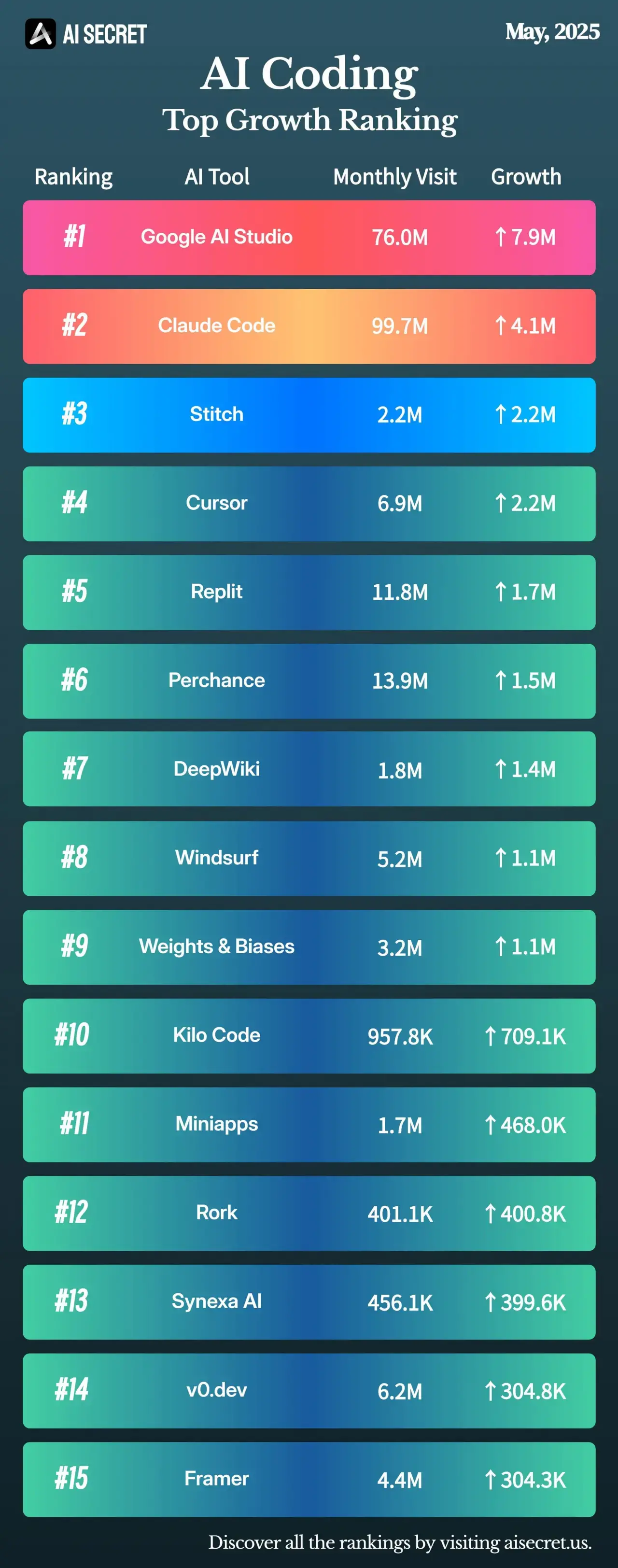 Google AI Studio, +7,9 milyonluk büyüme ile kodlama araçları kategorisinde zirvede. Hem kurumsal hem de açık kaynak topluluklarında kullanım oranı hızla artıyor.