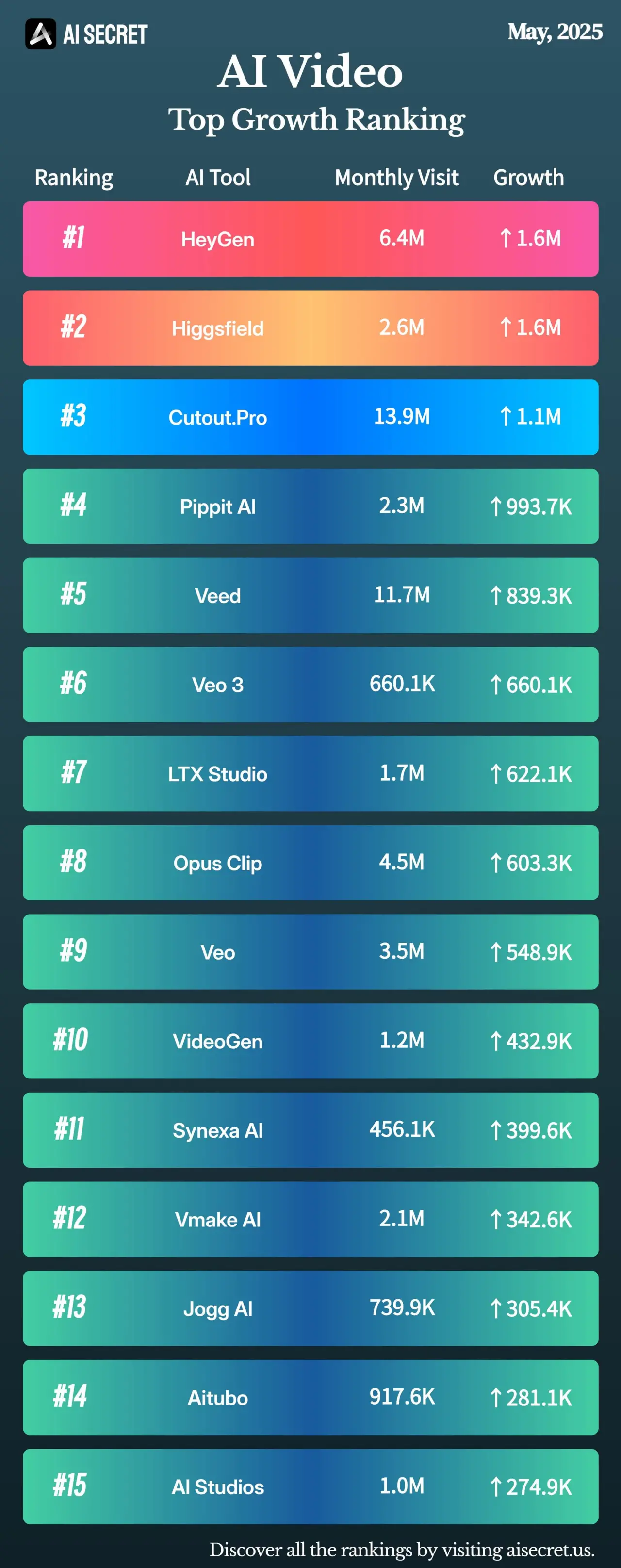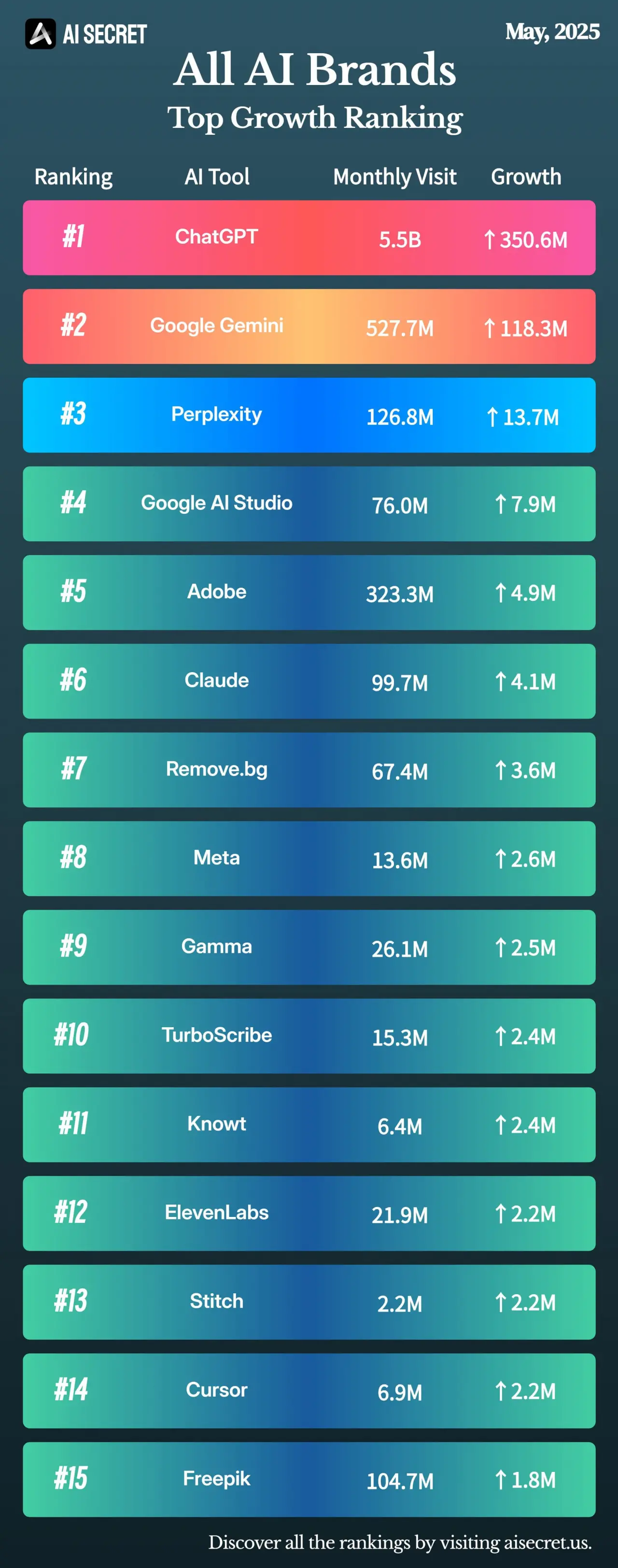 Yapay zekâ endüstrisi tarihinin en hızlı dönüşüm dönemine tanıklık ediyoruz. 2025’in Mayıs ayında, küresel kullanıcı trafiği verileri analiz edilerek hazırlanan AI Secret Top Growth Rankings raporu, sektördeki gizli dinamikleri ve yeni liderleri gün yüzüne çıkarıyor. Rapor, sadece manşetlerden ibaret değil; kullanıcıların gerçek ilgisine ve kullanım alışkanlıklarına dayanıyor.