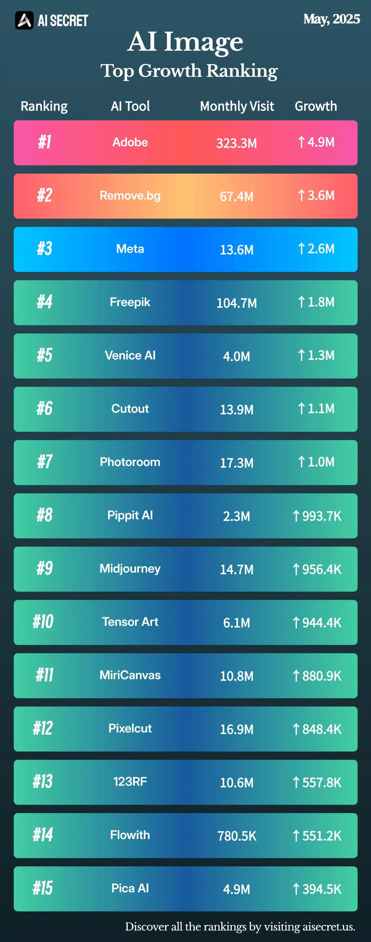 Adobe, Photoshop ve Express’e entegre ettiği Firefly modeliyle +4,9 milyon büyüme sağladı. Midjourney, Pixelcut ve Remove.bg gibi araçlar ise görsel üretimde hem hız hem de stil arayan profesyonellere hitap ediyor.