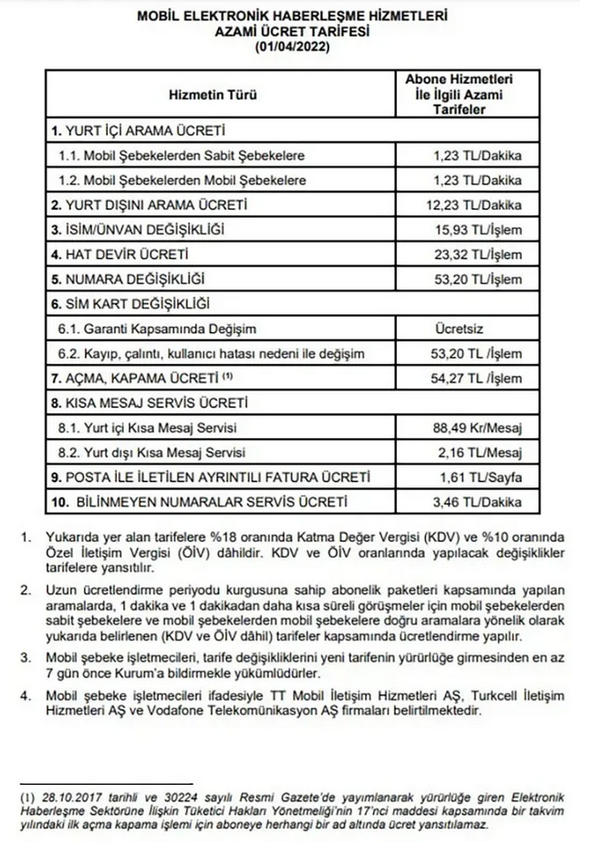 Hat devir ücreti 23 lira 32 kuruşa, numara değişikliği 53 lira 20 kuruşa ve sim kart değişimi de 53 lira 20 kuruşa yükseldi.