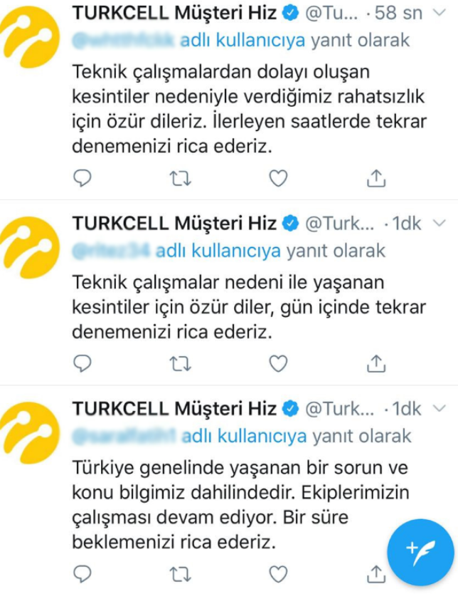 Milyonlarca ev ve cep telefonu üzerinden internet hizmeti alan vatandaş bugün erişim probelemi yaşadığından dolayı mağdur durumda. Şirket yaşanan internet kesintisiyle ilgili olarak yaptığı açıklamada; "Teknik çalışmalar için yaşanan kesintiler için özür dileriz. Gün içinde tekrar denemenizi rica ederiz. Teknik çalışmalardan dolayı oluşan kesintiler nedeniyle verdiğimiz rahatsızlık için özür dileriz." ifadelerini kullandı.