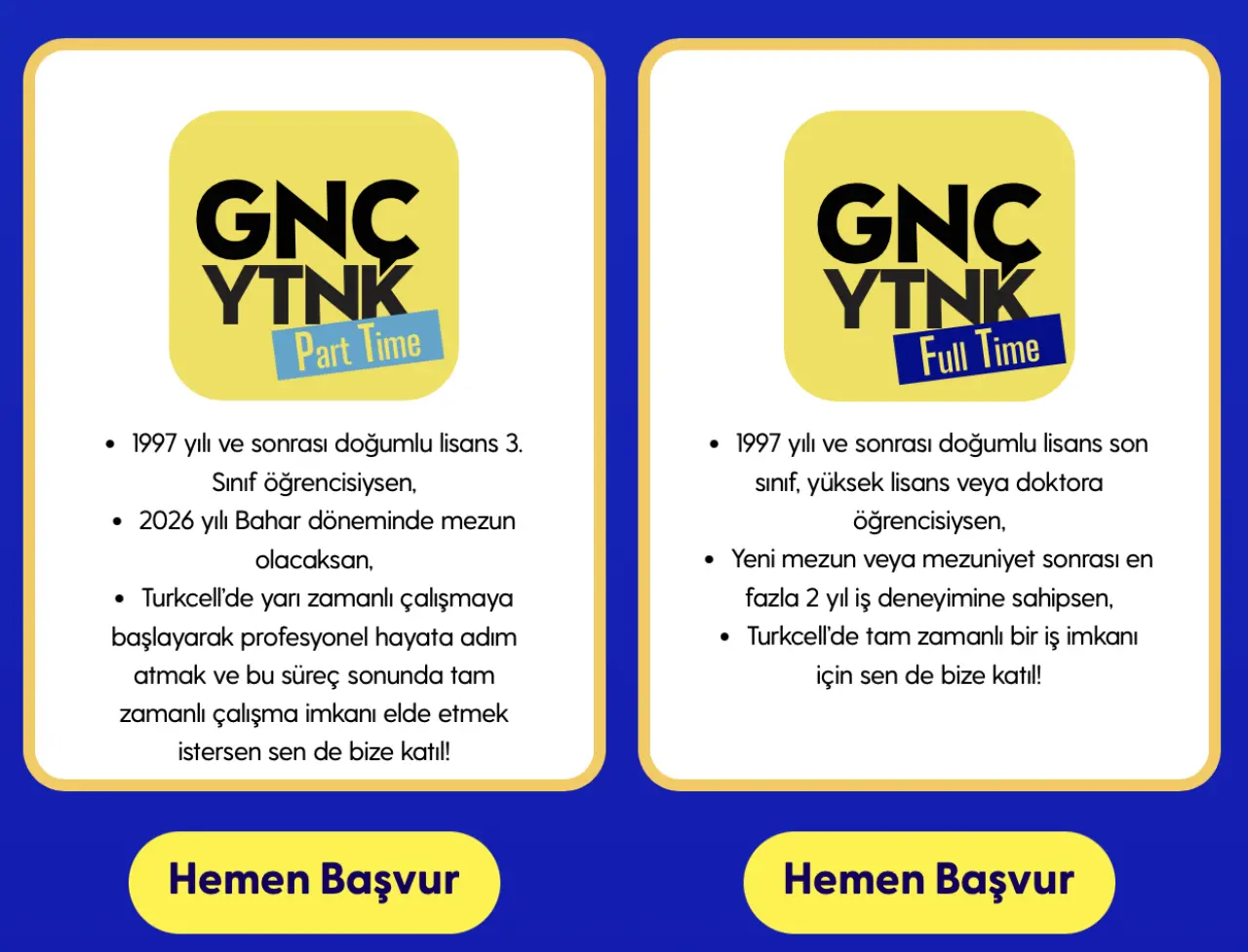 GNÇYTNK'ün tam zamanlı programına, 1997 yılı ve sonrası doğumlu, lisans son sınıf, yüksek lisans veya doktora öğrencisi, yeni mezun ya da en fazla 2 yıl iş deneyimine sahip adaylar, yarı zamanlı programına ise lisans 3. sınıf öğrencileri, Turkcell'in internet sitesinden 9 Mart'a kadar başvurabilecek.