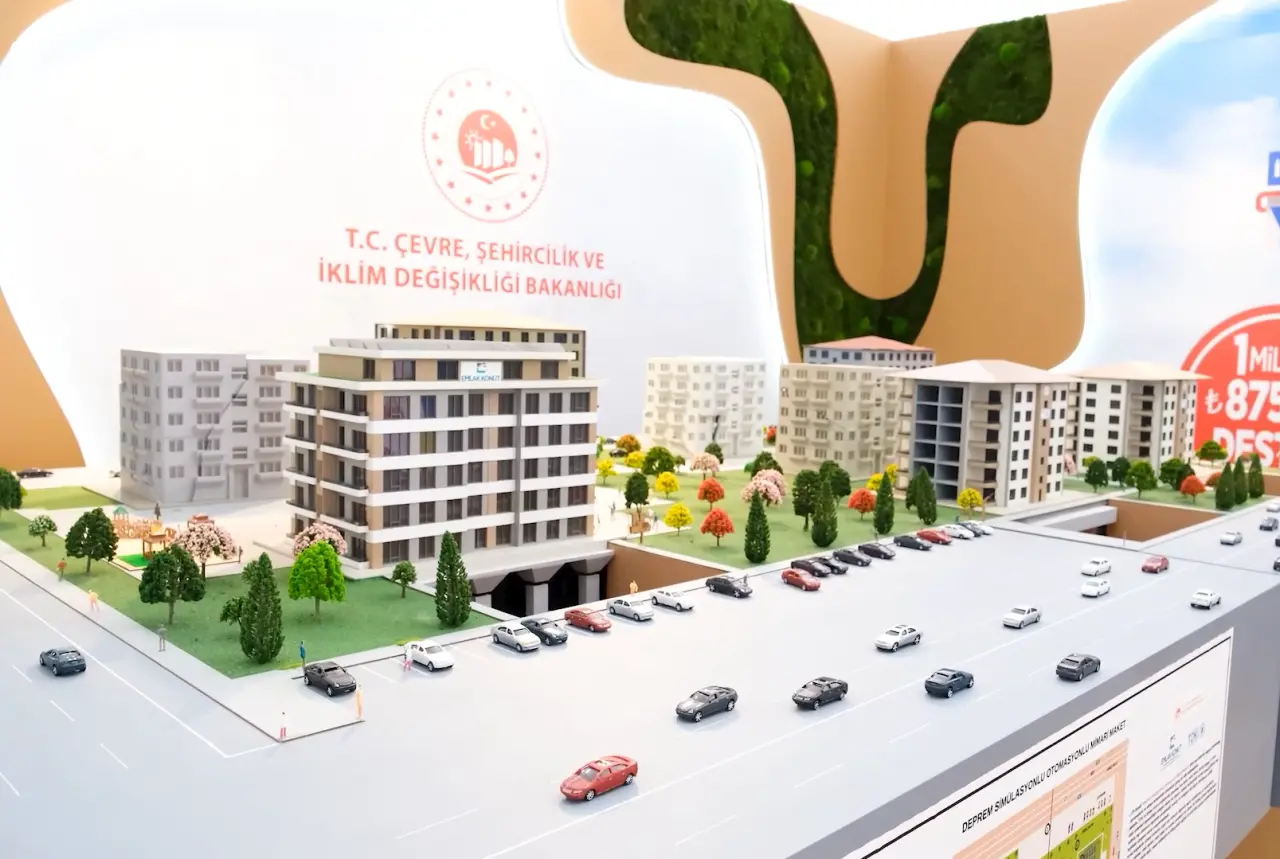 Maket binalarla deprem anı simülasyonu yapılırken, TOKİ konutları gibi güvenli binaların nasıl sağlam kaldığı uygulamalı olarak gösteriliyor.