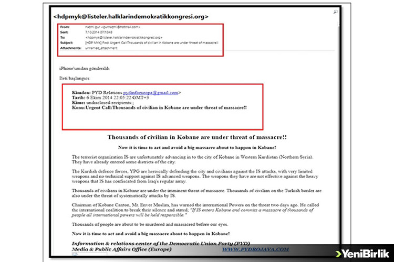 Raporda, imza ve adres kısmında "PYD Medya ve Halkla İlişkiler Ofisi (Avrupa) Bilgi ve İlişkiler Merkezi" bilgisinin yer aldığı e-postanın, terör örgütü PKK'nın Suriye kolu PYD tarafından, HDP'ye gönderildiğine dikkat çekildi.