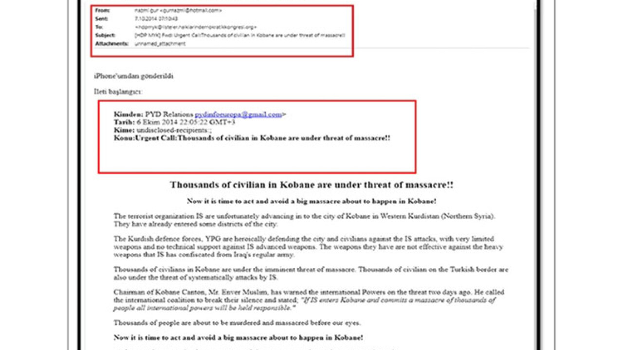 Buna ilişkin emniyetin hazırladığı ve davanın ek klasörlerinde yer alan raporda, söz konusu e-postanın, "6 Ekim 2014 saat 22.05"te, "[email protected]" adresinden davanın tutuklu sanığı eski HDP MYK Üyesi Nazmi Gür'e, ondan da dönemin HDP MYK üyelerinin yer aldığı "[email protected]" adresine gönderildiği tespit edildiği belirtildi.