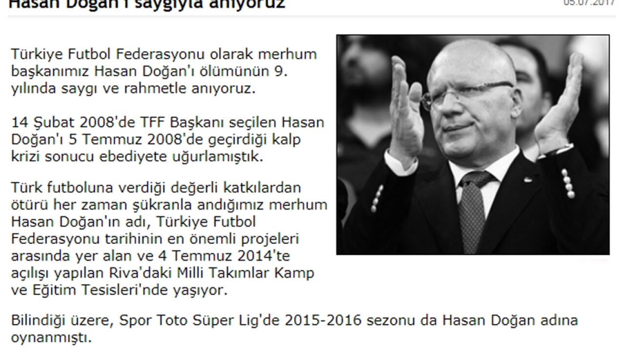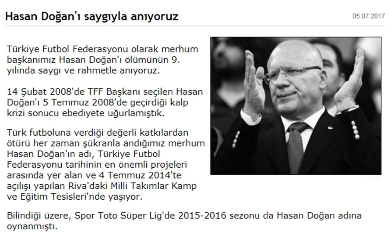 TFF’nin mesajında, "Futbol Federasyonu olarak merhum başkanımız Hasan Doğan’ı ölümünün 9. yılında saygı ve rahmetle anıyoruz. 14 Şubat 2008’de TFF Başkanı seçilen Hasan Doğan’ı 5 Temmuz 2008’de geçirdiği kalp krizi sonucu ebediyete uğurlamıştık. Türk futboluna verdiği değerli katkılardan ötürü her zaman şükranla andığımız merhum Hasan Doğan’ın adı, Türkiye Futbol Federasyonu tarihinin en önemli projeleri arasında yer alan ve 4 Temmuz 2014’te açılışı yapılan Riva’daki Milli Takımlar Kamp ve Eğitim Tesislerinde yaşıyor.Bilindiği üzere, Spor Toto Süper Lig’de 2015-2016 sezonu da Hasan Doğan adına oynanmıştı" denildi.
