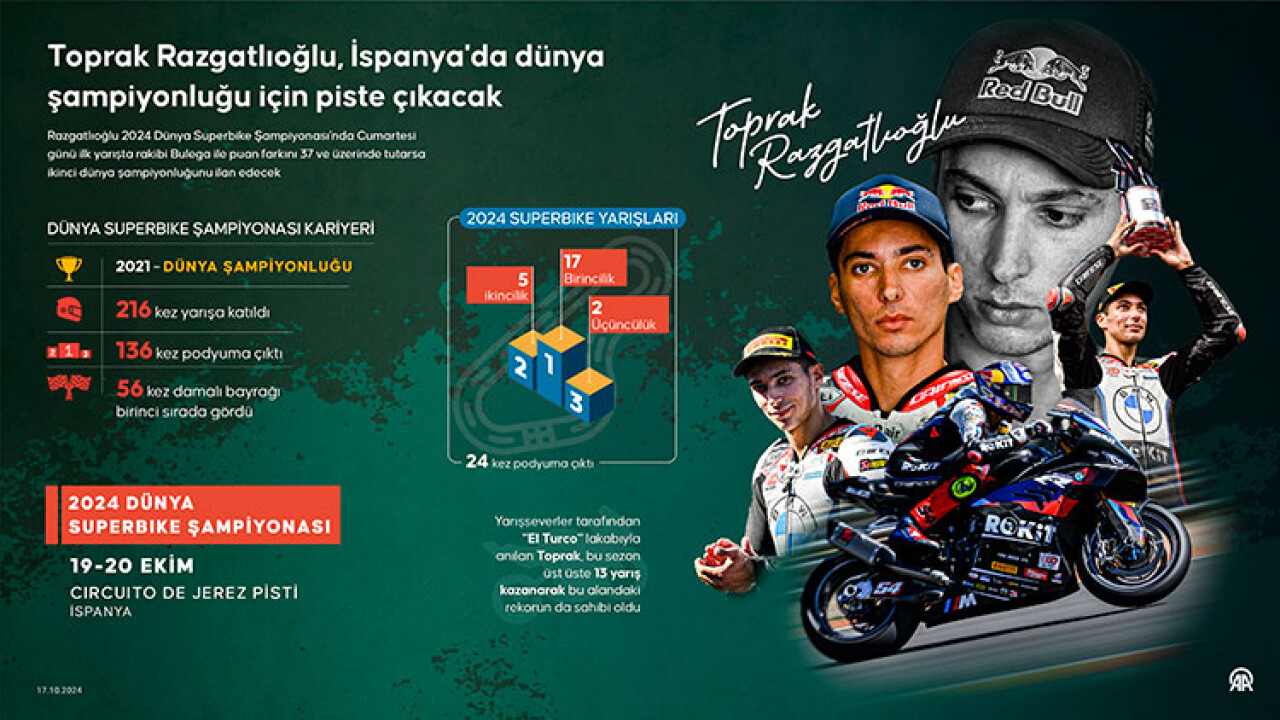 Dünya genelinde yarışseverler tarafından "El Turco" lakabıyla anılan Toprak Razgatlıoğlu, Jerez'de 19 Ekim Cumartesi günü koşulacak ilk yarışta en yakın rakibi İtalyan Nicolo Bulega ile puan farkını 37 ve üzerinde tutarsa, 20 Ekim'deki yarışlara bakılmaksızın 2024 dünya şampiyonluğunu garantileyecek.