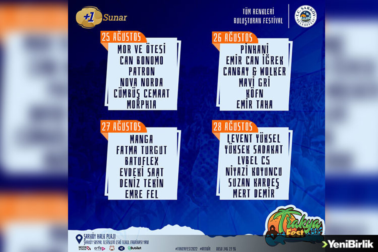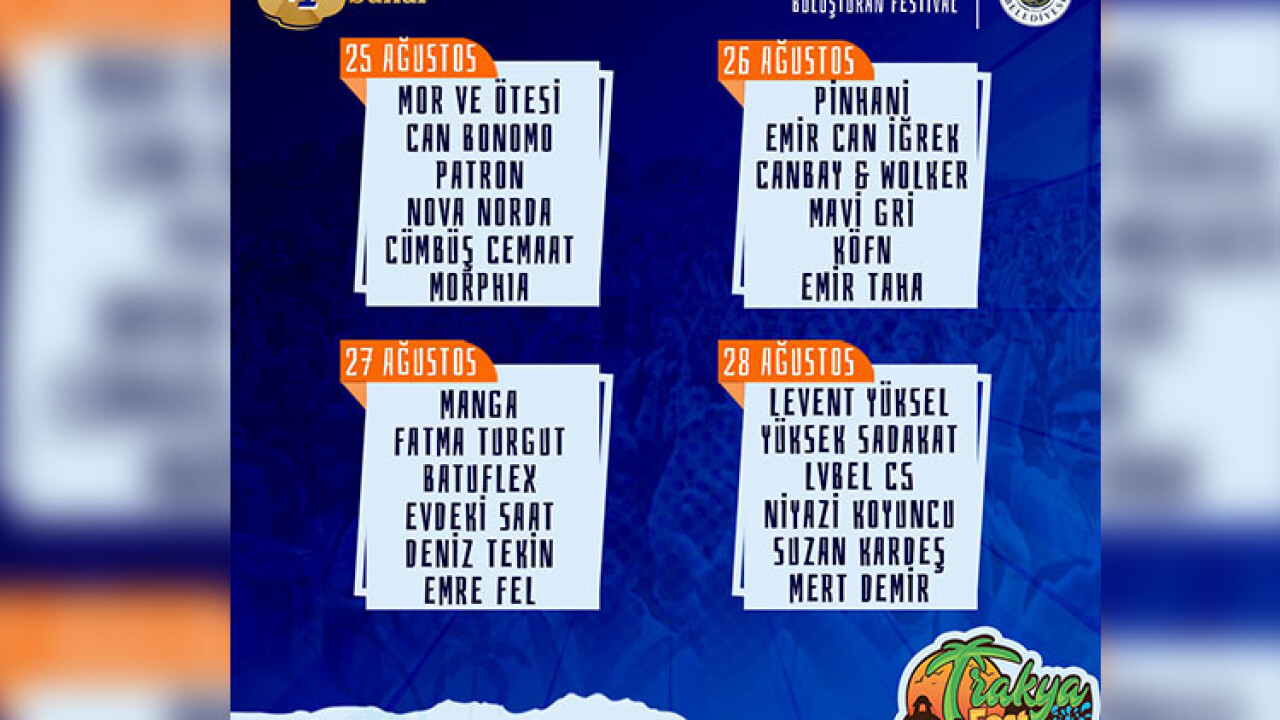 Geçtiğimiz üç yılda binlerce müzikseveri en sevdikleri sanatçılarla buluşturan Trakya Fest, bu yıl da mor ve ötesi'nden Pinhani'ye; maNga'dan Levent Yüksel'e; Can Bonomo'dan Yüksek Sadakat'e; Nova Norda'dan Suzan Kardeş'e müziğin yıldızlarını dört gün boyunca Şarköy Halk Plajı'nda ağırlayacak.