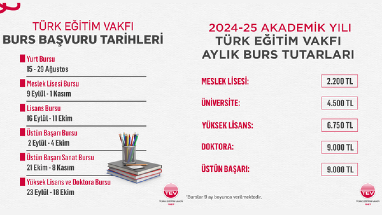 TEV, farklı eğitim seviyelerindeki öğrencilere yönelik burs programlarına ilişkin başvuru tarihlerini belirledi. Yurt bursu başvuruları 15-29 Ağustos tarihleri arasında yapılabilecek. Meslek lisesi öğrencileri için burs başvuru dönemi 9 Eylül'de başlayacak ve 1 Kasım'a kadar devam edecek. Lisans öğrencileri ise 16 Eylül-11 Ekim tarihleri arasında burs başvurularını gerçekleştirebilecekler. TEV’in Üstün Başarı Bursuna (ÜBB) başvurular 2 Eylül-4 Ekim tarihleri arasında alınacak. Sanat alanında eğitim gören ve ÜBB Sanat Bursu’na başvurmak isteyen öğrenciler için başvuru süreci 21 Ekim-8 Kasım tarihleri arasında olacak. Yüksek lisans ve doktora burslarına başvurmak isteyen adaylar için ise başvuru tarihleri 23 Eylül-18 Ekim olarak belirlendi.