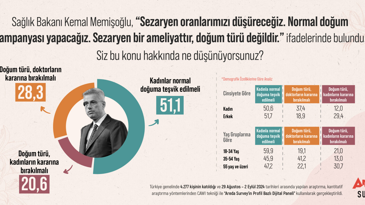 Areda Survey araştırma şirketi, doğum yöntemleri üzerine yapılan tartışmalara yönelik bir araştırma gerçekleştirdi. Araştırmada, Sağlık Bakanı Kemal Memişoğlu’nun “Sezaryen oranlarımızı düşüreceğiz. Normal doğum kampanyası yapacağız. Sezaryen bir ameliyattır, doğum türü değildir.” ifadeleri de hatırlatılarak halkın doğum konusuna olan yaklaşımları incelendi.