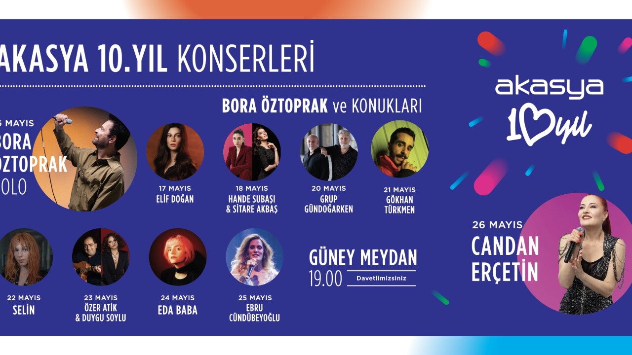 10’uncu yıl ruhunu sene boyunca alışveriş merkezinin her köşesinde yaşatacak olan Akasya’nın, ünlü şarkıcıların ağırlanacağı konserler serisi, 16 Mayıs’ta başlayacak. 10’uncu yıl konserlerinin açılışını pop müziğin başarılı ismi Bora Öztoprak yapacak. Başarılı sanatçı, solo konserinin ardından 17-18-20-21-23-24 ve 25 Mayıs’ta vereceği yedi konserde sahnesinde ünlü şarkıcıları misafir edecek. 17 Mayıs’ta Elif Doğan, 18 Mayıs’ta Hande Subaşı-Sitare Akbaş, 20 Mayıs’ta Grup Gündoğarken, 21 Mayıs’ta Gökhan Türkmen, 23 Mayıs’ta Özer Atik-Duygu Soylu, 24 Mayıs’ta Eda Baba ve 25 Mayıs’ta Ebru Cündübeyoğlu, Bora Öztoprak’ın sahnesine konuk olup Güney Meydan’da saat 19:00’da en sevilen şarkılarını seslendirecek. 22 Mayıs’ta ise pop müziğin sevilen ismi Selin Geçit’in solo konseri gerçekleşecek.